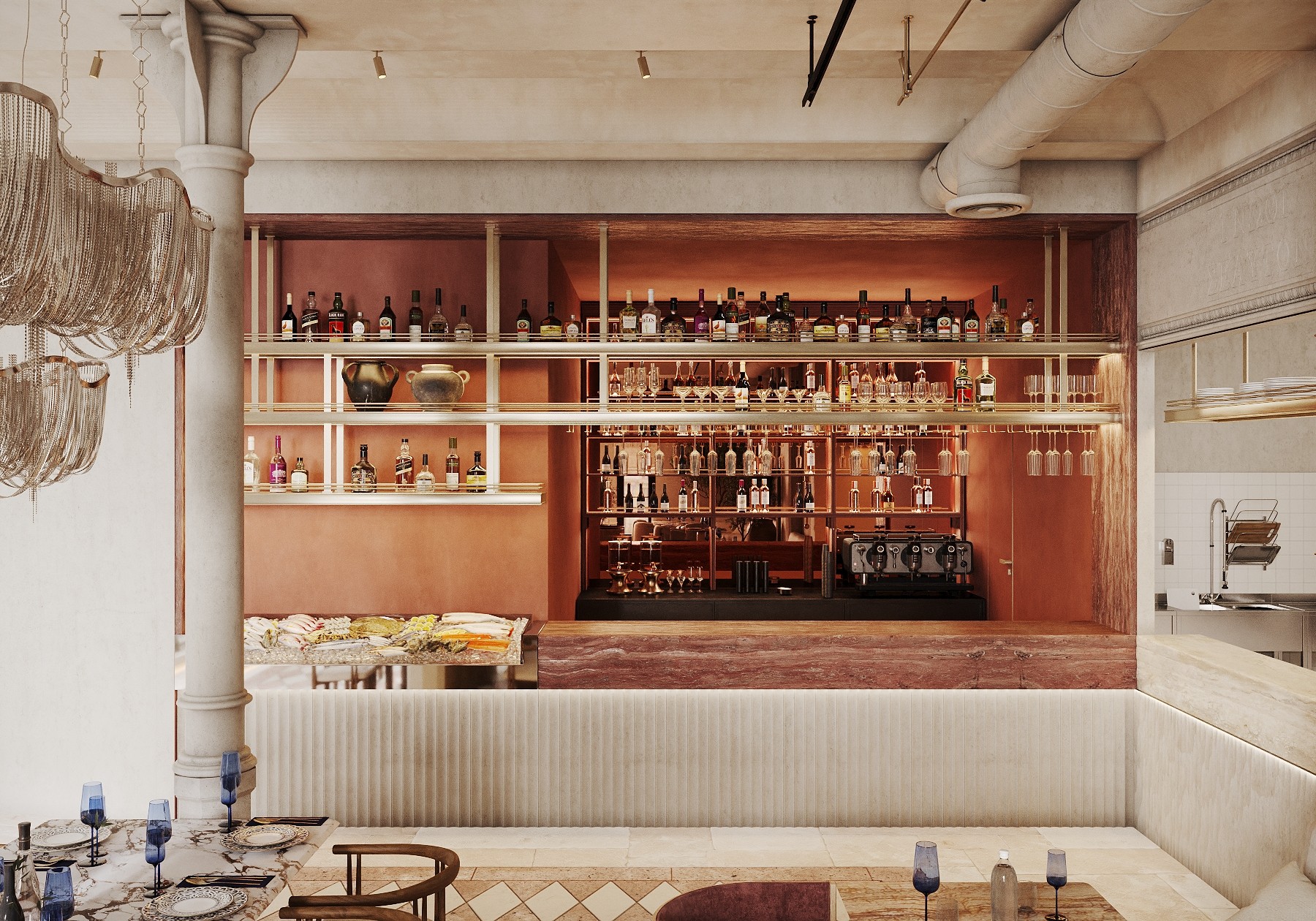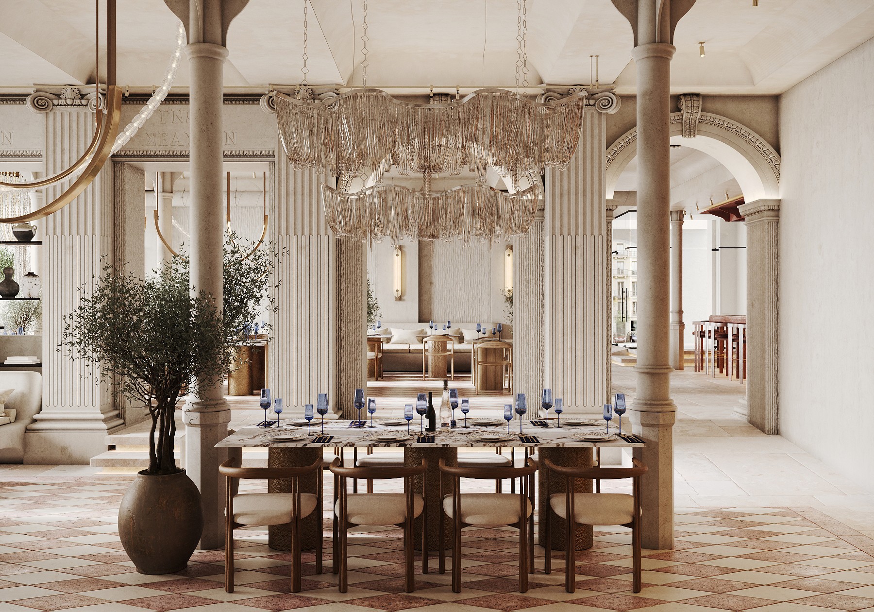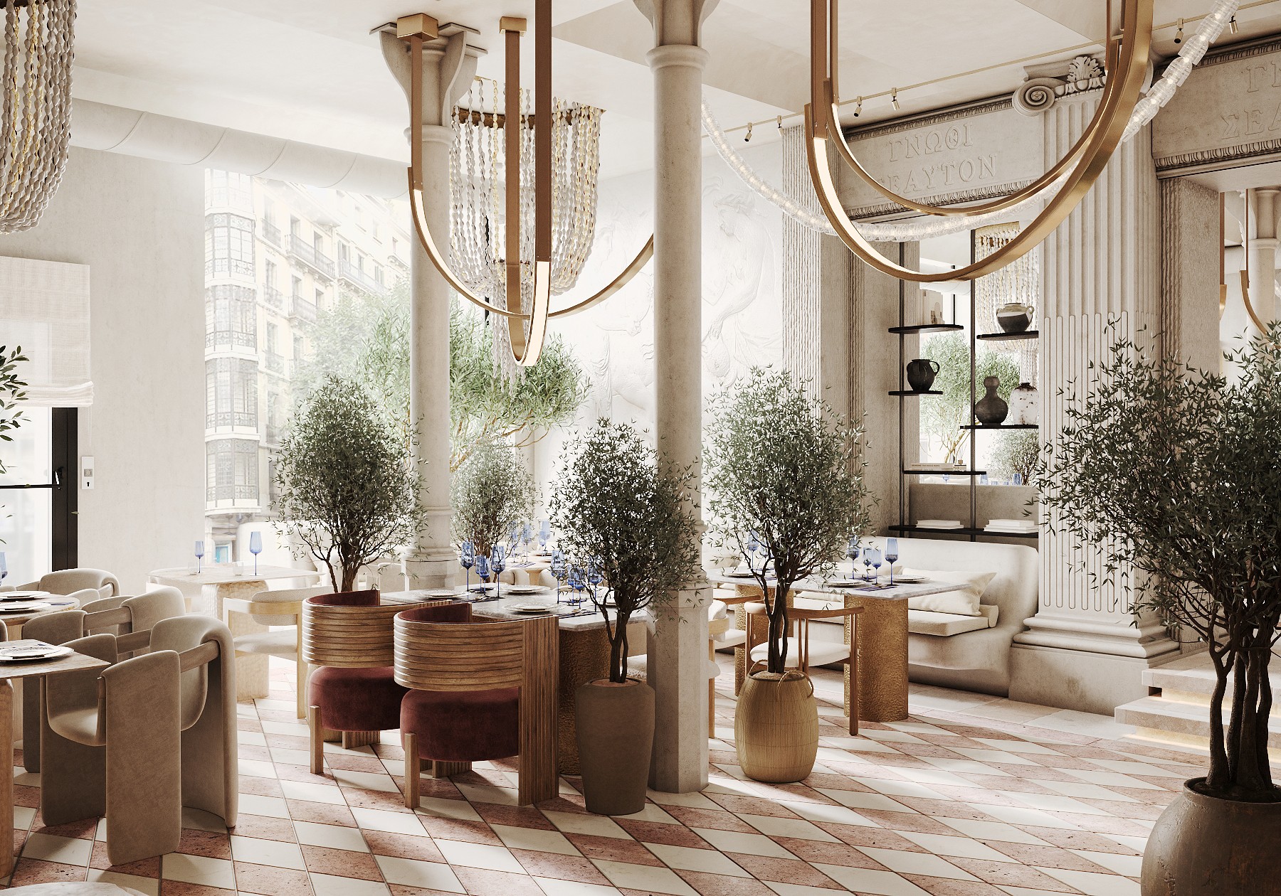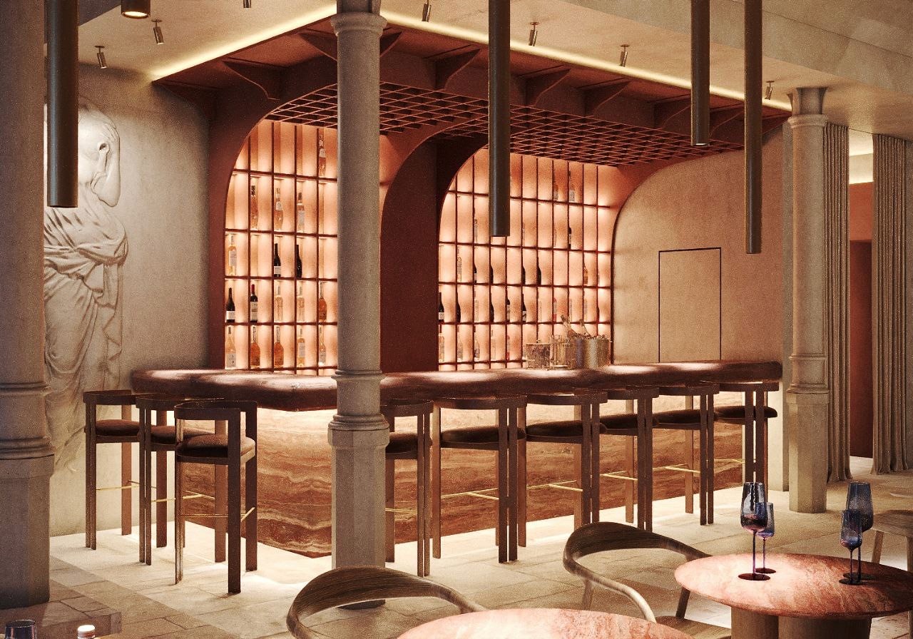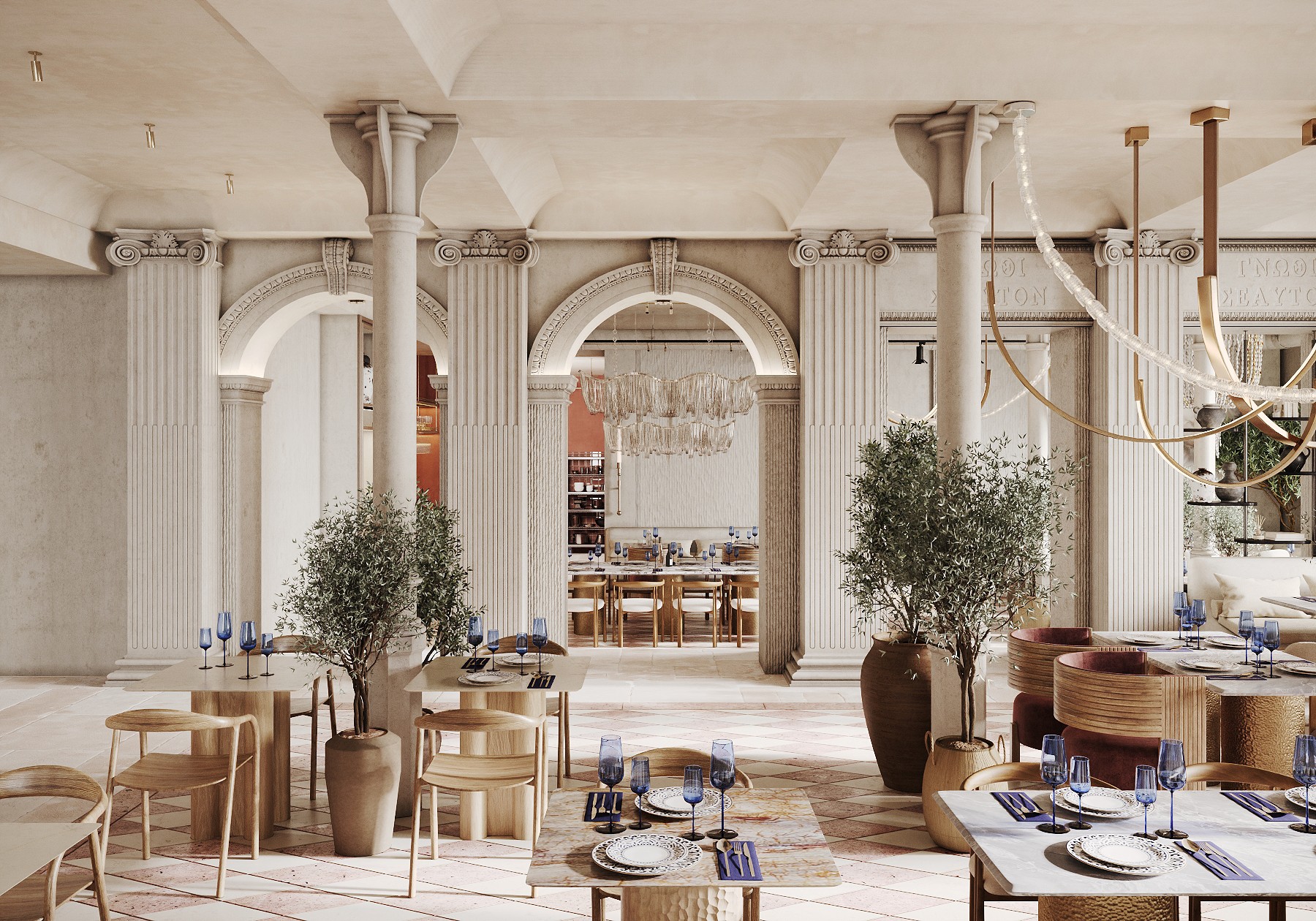 A large-scale project in the heart of Barcelona — a restaurant with two dining halls totaling 300 m². The concept is inspired by Greek aesthetics while moving away from the typical blue-and-white palette. The interior evokes a temple of ancient goddesses, combining soft Mediterranean luxury with refined cuisine.